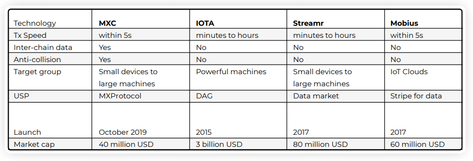 MXC ile diğer projelerin karşılaştırıldığı tablo