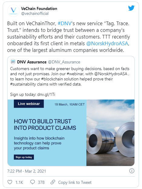 Arnold’un Mart ayında yükseliş beklediği bir diğer platform tedarik zinciri yönetimi aracı VeChain (VET). Çünkü VeChain, dünyanın en büyük alüminyum şirketlerinden biri olan Norveç merkezli Hydro ile bir anlaşmaya vardı. Hydro artık ürünlerini belgelemek için VeChain üzerine inşa edilecek bir platformu kullanacak.