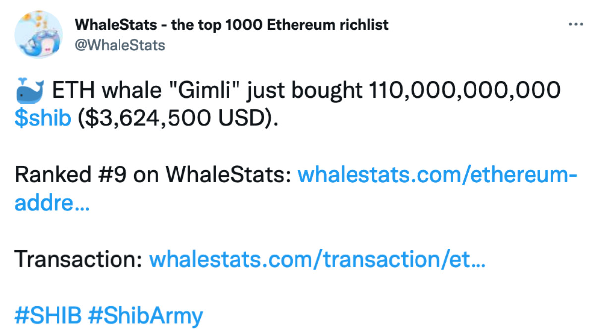 Gimli, kaydedilen verilerde 110 milyar Shiba Inu ya da fiat para cinsinden söyleyecek olursak 3.62 milyon dolar değerinde SHIB satın aldı. Ünlü balina, elinde 47.8 milyon dolar değerinde Shiba Inu’ya hükmediyor. Bununla birlikte Gimli, toplam 1.6 milyar dolar değerinde ERC-20 token’ına sahip ve bu da onu en büyük balinalardan biri yapıyor.