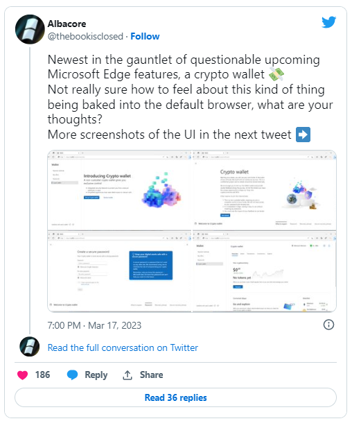 Albacore karamsar bir şekilde, “Microsoft Edge’in yaklaşmakta olan şüpheli özelliklerinin en yenisi olan bir kripto cüzdanı, bu tür bir şeyin varsayılan tarayıcıya eklenmesi konusunda nasıl hissedeceğinden emin değil” dedi.