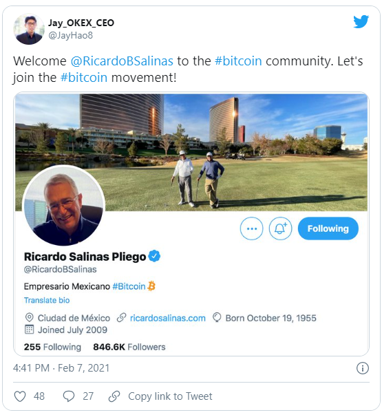 Dünyanın önemli zenginleri kripto para birimleri konusunda Elon Musk’ın yolundan gidiyor gibi görünüyor. Grupo Salinas’ın başkanı ve Meksika’nın en zengin üçüncü kişisi Ricardo Salinas Pliego, sosyal medyada Bitcoin’i kullanıyor.