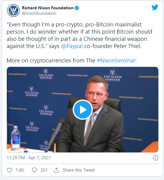 PayPal’ın kurucu ortağı ve risk sermayedarı Peter Thiel Çarşamba günü katıldığı bir sanal etkinlikte, Çin’in Bitcoin’i Amerika’ya karı finansal bir araç olarak kullanabileceğini dile getirdi.