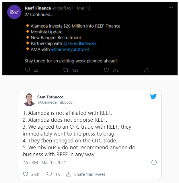 Geçtiğimiz günlerde Alameda Research’te bir yatırımcı ve bir ekip üyesi olan Sam Trabucco, Alameda’nın Reef’e hiçbir şekilde bağlı olmadığını belirterek kullanıcıları DEX ile iş yapmaktan kaçınmaya çağırdı ve bu durum tartışmalar neden oldu. Trabucco’nun bu açıklamasının Alameda’nın Reef’e 20 milyon dolar yatırım yaptığının ortaya çıkmasından hemen sonra gelmesi ise daha büyük kafa karışıklığına sebep oldu.