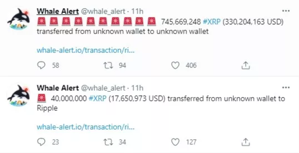 Kripto para birimleri ile gerçekleşen büyük işlemleri takip eden bir Twitter hesabı olan Whale Alert, son 12 saat içinde Ripple tarafından gerçekleştirilen iki büyük işlem olduğunu ve bu iki işlemin toplam 347.855.136 dolar değerinde olduğunu açıkladı.