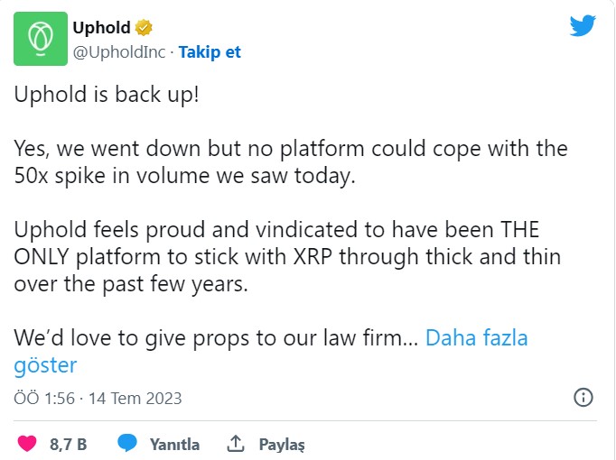 Bununla birlikte, karar, XRP fiyatında %70’in üzerinde ralli yapan bir ilk artışa yol açtı. Aniden XRP satın alma telaşı, bazı kripto borsalarını alt üst eden bir hacim artışına yol açtı. Birincisi, ABD merkezli bir kripto borsası olan Uphold, teknik sorunlar yaşadı ve benzeri görülmemiş hacim artışı nedeniyle geçici olarak düşüş yaşadı.