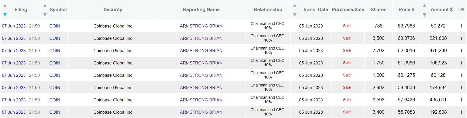 Dataroma’nın verilerine göre Coinbase CEO’su Brian Armstrong, ABD Menkul Kıymetler ve Borsa Komisyonu’nun (SEC) şirkete karşı açtığı davanın 6 Haziran’da hisselerini %15’ten fazla değer kaybetmesinden önce, 5 Haziran’da 1,8 milyon dolar değerinde şirket hissesi sattı.