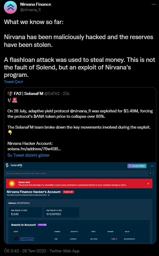 Nirvana Finance‘in yerel tokeni ANA’nın %85 oranında düşüşüne de sebep olan flash loan saldırısı, 3,49 milyon dolarlık Tether (USDT) kaybına neden oldu ve SolanaFM ekibi fonların bir flash loan yoluyla çekildiğini ilk doğrulayan ekip oldu. Konuyla ilgili yapılan açıklamalarda ise “Solend Protokolü’nün Flash Loan’larını kullanan bilgisayar korsanı, Nirvana Finans Hazinesinden 3,49 milyon USDT‘yi için kullanılan Solend Ana Havuz Kasasından 10 milyon ABD Doları ödünç aldı.” sözleri kullanıldı.