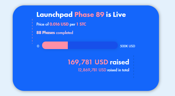 ICO, 2021 Şubat ayının başından beri mevcut ve şimdiye kadar 89. aşamaya ulaştı. Her aşamada, STC token’ın değeri 0.0002 USD artıyor ve bu aşamanın 500.000 dolarlık sabit bir sınıra sahip olduğu ifade ediliyor. Bu bir aydan kısa bir süre içinde ekibin 12 milyon doların üzerinde para toplamayı başardığını gösteriyor.