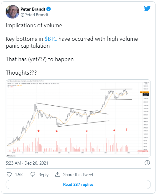 Brandt’ın açıklamalarına göre Bitcoin’de işlem hacmi azlığı, boğalar yeniden kontrolü ele geçirmeden önce bir süre daha düşüşün devam edeceğini gösteriyor. Brandt, önemli dip noktalarının, güçlü satış hacmiyle karakterize edilen panik teslimle gerçekleştiğini belirtiyor.