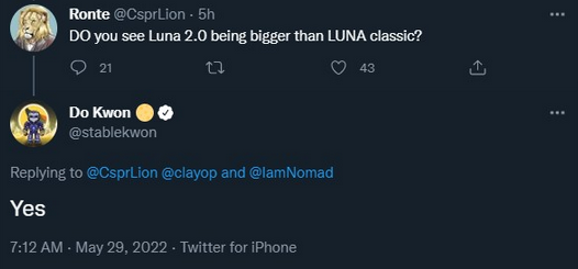 Aynı Twitter başlığında, kripto topluluğu üyesi @CsprLion, Do Kwon’a Terra 2.0’ın Terra classic’ten daha iyi olup olmayacağını sordu. Terra kurucusu Do Kwon ise hard fork ile başlatılan yeni Terra ağının çok daha iyi olacağını söyledi. Yazı hazırlandığı sırada LUNA yaklaşık 5 dolardan alıcı buluyor. Airdrop hakkedişi olan yatırımcılara parça parça dağıtım yapılacaktı. Bugünlerde toplam hakkedişin %30’u gönderiliyor ve 6 aylık periyotlarda kalan kısmı da ulaştırılacak. Arzın parçalı şekilde dağıtılmasındaki temel amaç ise fiyatı mümkün olduğunca ikinci bir çöküşten kurtarmaktır.