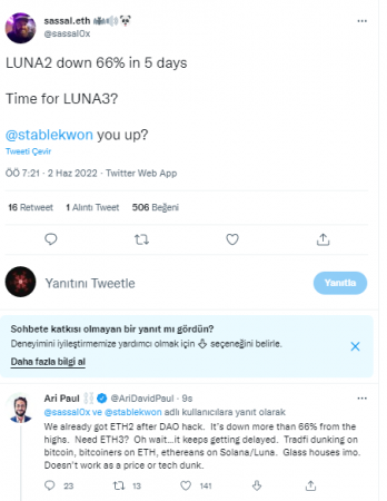 Ethereum eğitimcisi @sassal0x “LUNA2 5 günde %66 düştü. LUNA3 ne zaman gelecek?” dedi. Tweet’e yanıt olarak, melek yatırımcı ve kripto savunucusu Ari Paul, ünlü 2016 DAO hackinden sonra ETH2’nin nasıl doğduğunu açıklayarak sosyal medyada başlaması muhtemel eleştiri yağmurunun önünü kesmeye çalıştı.