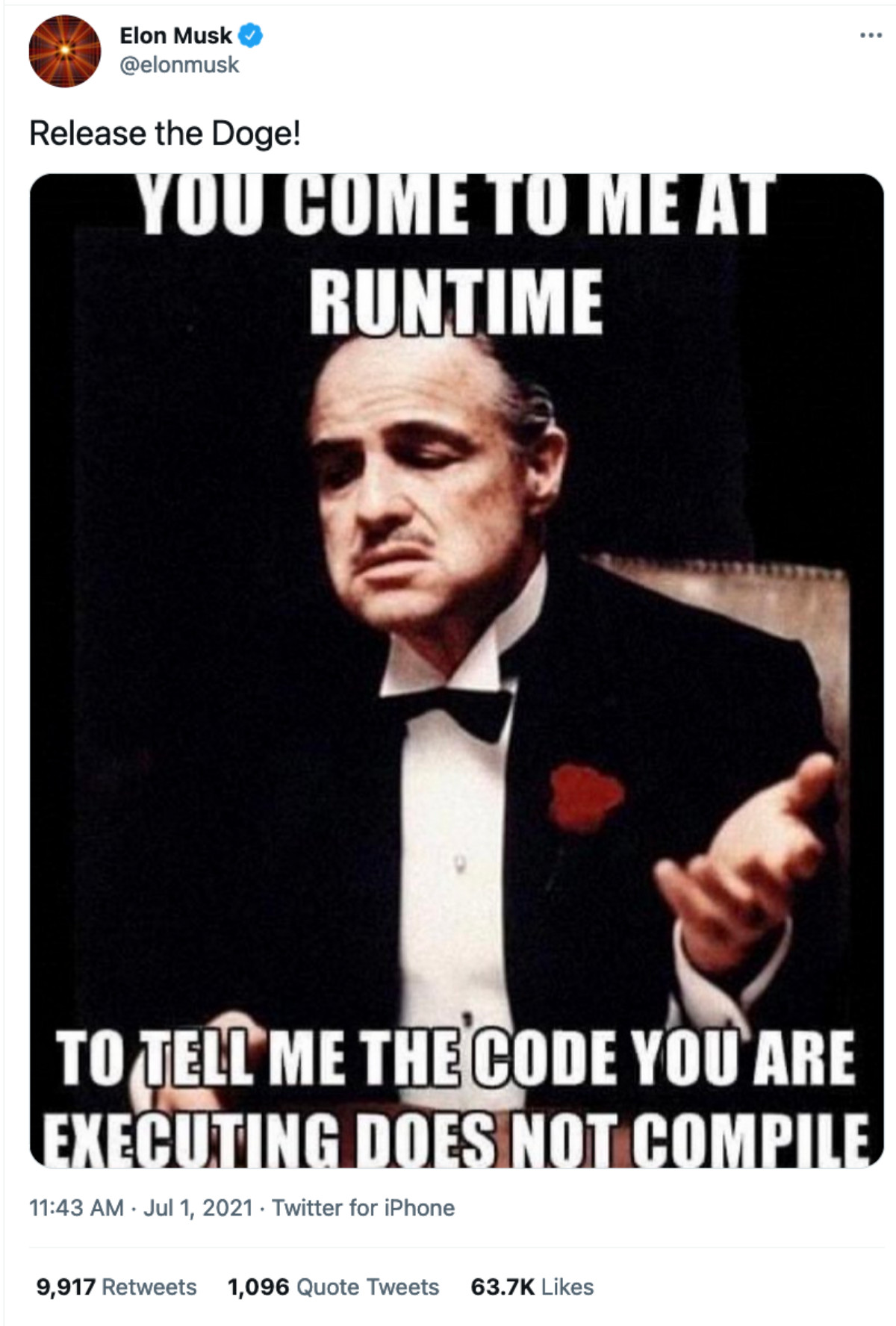 Tesla CEO’su Elon Musk, gün içerisinde Dogecoin ile ilgili tweet atarak dikkatleri üzerine çekti. Godfather filminden bir kesit paylaşan milyarder isim, DOGE’un serbest bırakılması gerektiğini aktardı.
