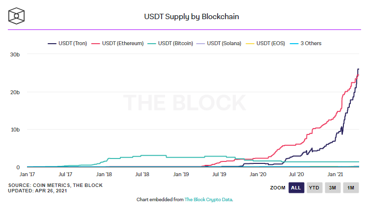 The Block Research’ün araştırmasına göre Tether’in Tron Blockchain’indeki arzı 26 milyar dolar iken Ethereum Blockchain’inde arz 24,4 milyar dolarda kalıyor.