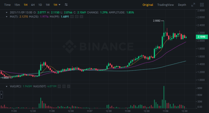 Son verilere göre LRC 0,37 dolar gibi düşük bir seviyeden yükselişe geçti ve yazının yayına hazırlandığı sırada LRC fiyatının 2.10 dolar seviyesinde işlem gördüğü görülüyor. Bu yükseliş Loopring’in piyasa değeri bakımından en büyük ilk 100 kripto para arasına girmesini sağladı.