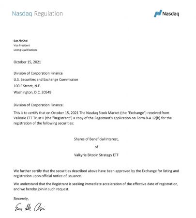 Nasdaq, SEC‘in yakında Valkyrie Bitcoin Strategy ETF’sini onaylayabileceğini ima ediyor. Nasdaq’ın listeleme yeterliliklerinden sorumlu başkan yardımcısı Eun Ah Choi, Valkyrie‘nin Bitcoin ETF‘sinin borsada listelenmek üzere onaylandığını söyledi. Bu nedenle yakında ilgili başvuru SEC tarafından onaylanabilir ve buna hazırlık yapılıyor.