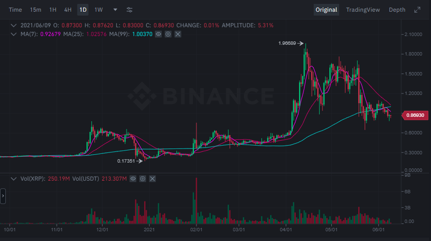Yaşanan geri çekilmeler sırasında piyasa hacmi bakımından en büyük yedinci kripto para birimi olan Ripple (XRP), 0,78 dolara kadar geriledi. Bu durum her ne akdar 14 Nisan’da 1,96 dolara kadar ulaşan kripto para birimi için büyük bir düşüşe işaret etse de Aralık ayında görülen 0,17 dolarlık seviyenin oldukça üzerinde.