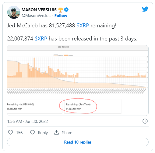 Çarşamba günü, bir TikTok influencer’ı ve Crypto Mason olarak bilinen YouTuber Mason Versluis, haberi Twitter’da 115.000 takipçisiyle paylaştı ve son üç gün içinde 22 milyon XRP’nin piyasaya sürüldüğünü ifade etti.